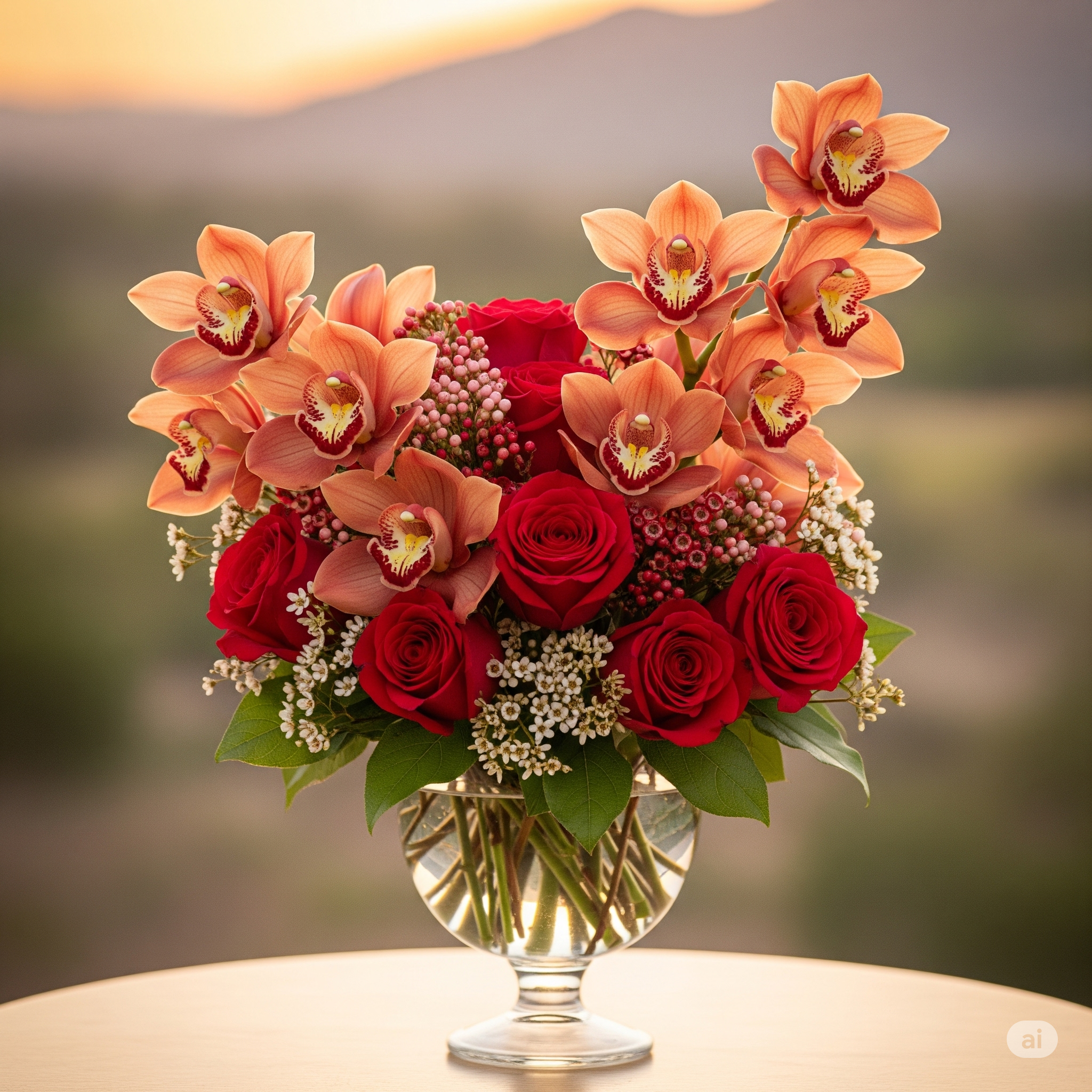 Un sofisticado centro de mesa con orquídeas cymbidium color coral, rosas rojas intensas y detalles de flor de cera. Inspirado en los atardeceres apasionados de Zicatela, ideal para celebrar un amor vibrante y lleno de vida en aniversarios especiales.
